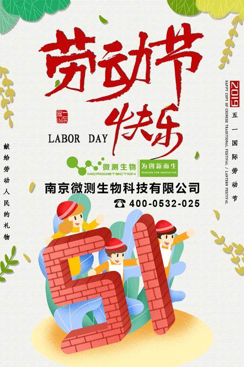 南京微測生物科技有限公司祝新老客戶朋友五一勞動(dòng)節(jié)快樂!友情提示:2019年5月1日起至2019年5月4日放假,共計(jì)4天,放假期間不發(fā)貨,5月5日上班恢復(fù)正常發(fā)貨。