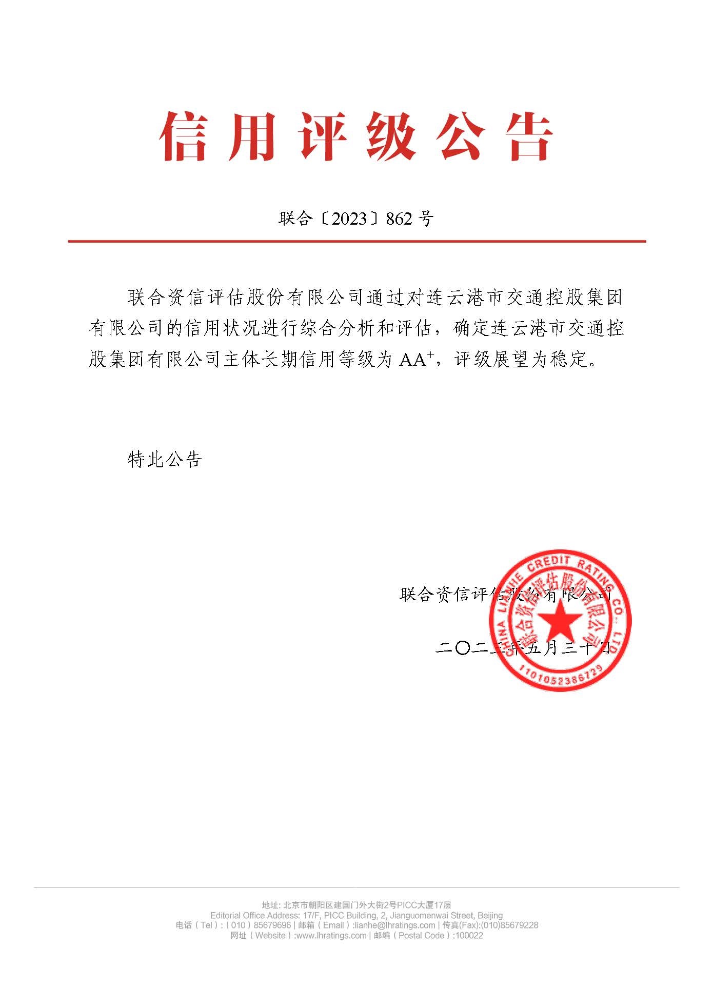 近日,聯(lián)合資信評(píng)估股份有限公司發(fā)布信用評(píng)級(jí)公告,確定連云港市交通控股集團(tuán)有限公司(以下簡(jiǎn)稱(chēng)“交通控股集團(tuán)”)主體長(zhǎng)期信用等級(jí)為AA+,評(píng)級(jí)展望為穩(wěn)定。