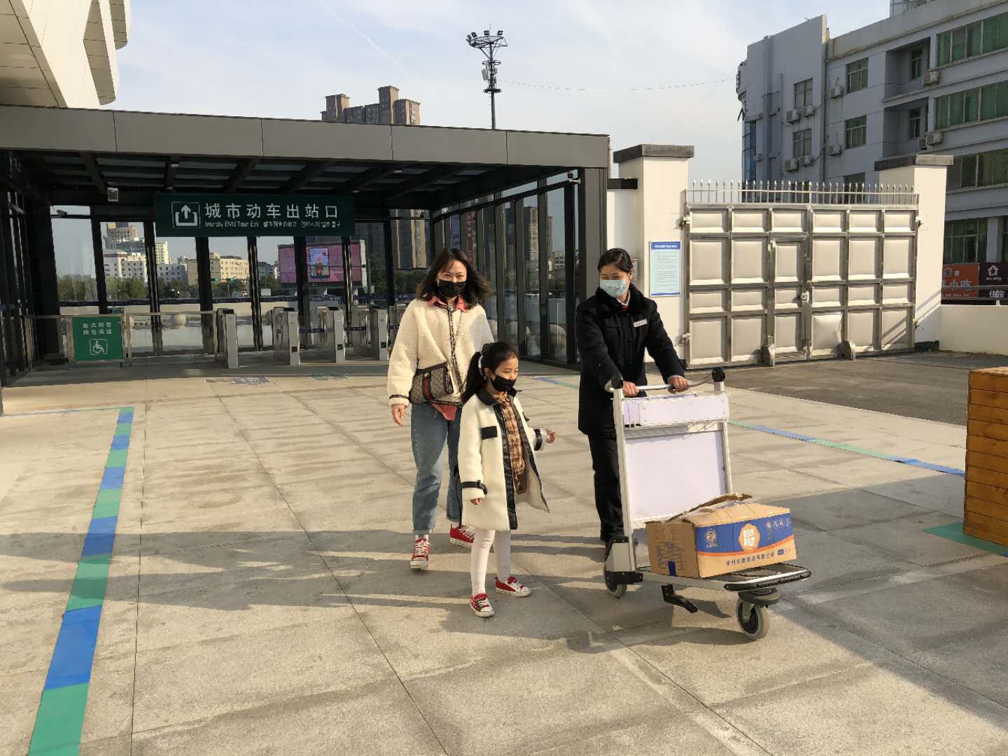 4月25日下午,乘坐第一班S3109的旅客大多數(shù)都是出行游玩的乘客。和往常一樣,城市動車組的站務(wù)員們在各自的崗位上值守著,這時一位年輕的母親帶著三歲的孩童,懷里還抱著一個很沉的大紙箱很吃力,緩慢地往站臺里走來。站務(wù)員劉倍倍趕忙上前接下她手中的大紙箱,減輕了她很大的負擔。在她出示連易通二維碼和進行完安檢后,站務(wù)員韓雪和劉倍倍幫她把紙箱放在座位旁。車次開始檢票時,站務(wù)員們將紙箱放在站內(nèi)的行李推車上,劉倍倍將其一直送到車廂內(nèi)。這位母親連聲道謝說:“太麻煩你們了,你們城市動車的服務(wù)真是太貼心了!”劉倍倍微笑的說:“能幫到您就是我們最開心的事情。”