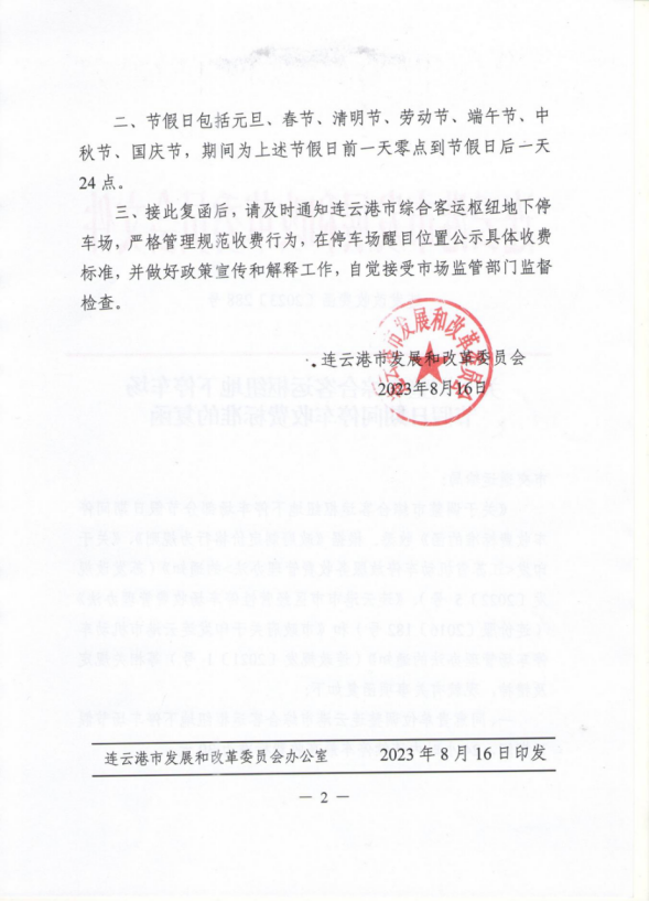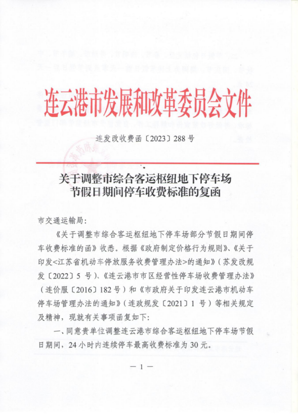 一、調(diào)整連云港市綜合客運樞紐地下停車場節(jié)假日期間24小時內(nèi)連續(xù)停車最高收費標(biāo)準(zhǔn)為30元。