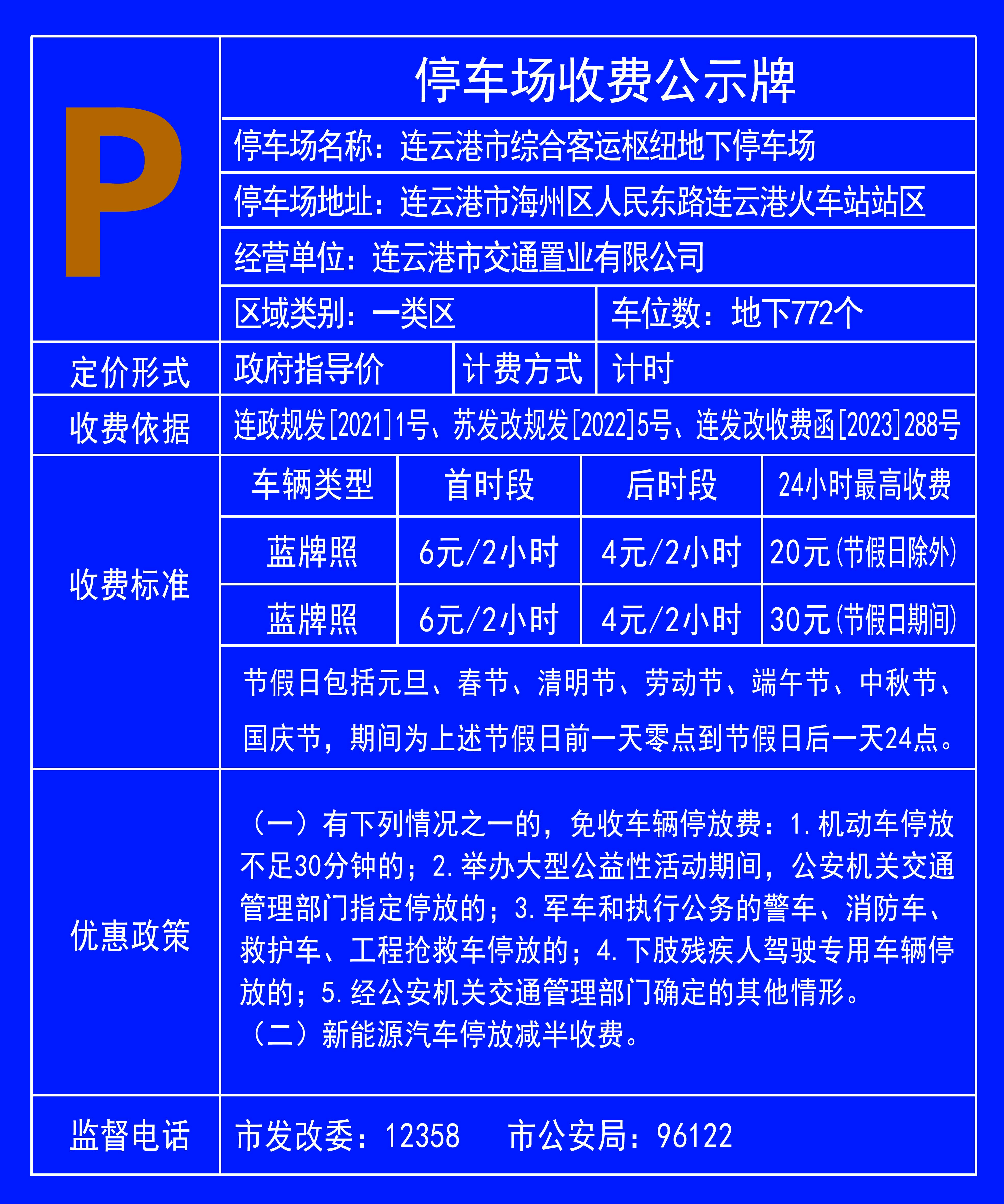 根據(jù)《政府制定價格行為規(guī)則》、《關(guān)于印發(fā)<江蘇省機(jī)動車停放服務(wù)收費管理辦法>的通知》(蘇發(fā)改規(guī)發(fā)〔2022〕5號)、《連云港市市區(qū)經(jīng)營性停車場收費管理辦法》(連價服〔2016〕182號)、《市政府關(guān)于印發(fā)連云港市機(jī)動車停車場管理辦法的通知》(連政規(guī)發(fā)〔2021〕1號)和(連發(fā)改收費函〔2023〕288號)等相關(guān)規(guī)定及精神,現(xiàn)就有關(guān)事項公告如下: