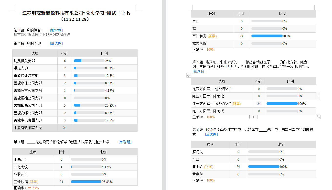 為深入開展黨史學(xué)習(xí)教育,創(chuàng)新黨史知識學(xué)習(xí)的方法和途徑,營造更加濃厚的學(xué)習(xí)氛圍,讓黨史學(xué)習(xí)教育“活”起來,明茂公司積極拓寬黨史學(xué)習(xí)渠道,強化學(xué)習(xí)覆蓋面和參與度,創(chuàng)新理論學(xué)習(xí)方式,以一部手機為依托每周開展微信黨史線上答題測試,通過融入知識性、趣味性、便捷性為一體的知識測試,及時跟蹤個人測試情況,利用碎片時間,隨時隨地檢驗學(xué)習(xí)成果,截止目前已開展28期。