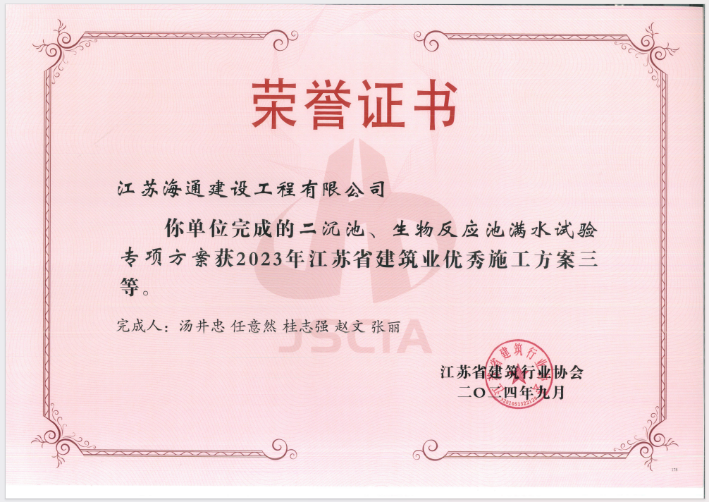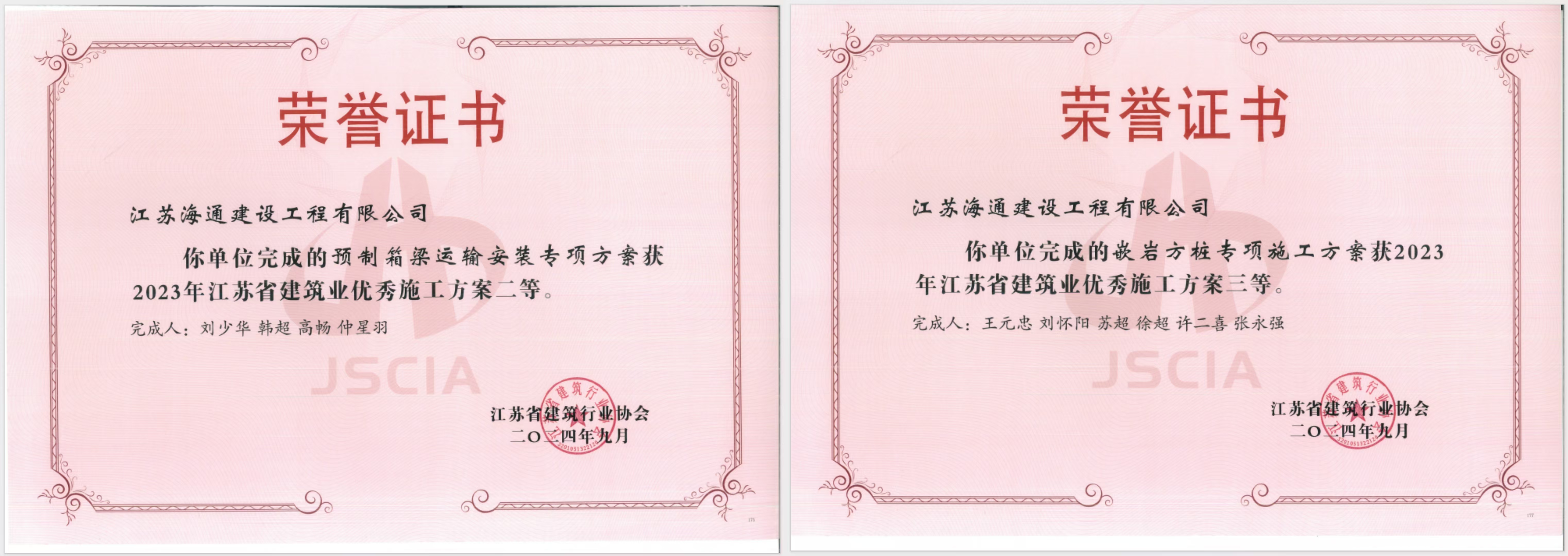 近日,江蘇省建筑行業(yè)協(xié)會公布了2023年度江蘇省建筑業(yè)優(yōu)秀施工方案評價結果,海建公司申報的三項施工方案獲得榮譽,其中《預制箱梁運輸安裝專項方案》獲得江蘇省建筑業(yè)優(yōu)秀施工方案二等,《嵌巖方樁專項施工方案》、《二沉池、生物反應池滿水試驗專項方案》獲得江蘇省建筑業(yè)優(yōu)秀施工方案三等。