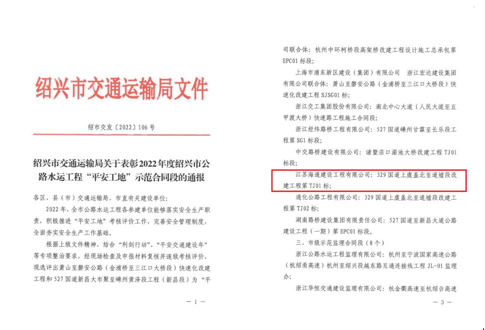 近日,從紹興市交通運輸局處獲訊,由江蘇海建公司承建的329國道上虞蓋北至道墟段改建工程第TJ01標榮獲紹興市市級示范“平安工地”稱號。