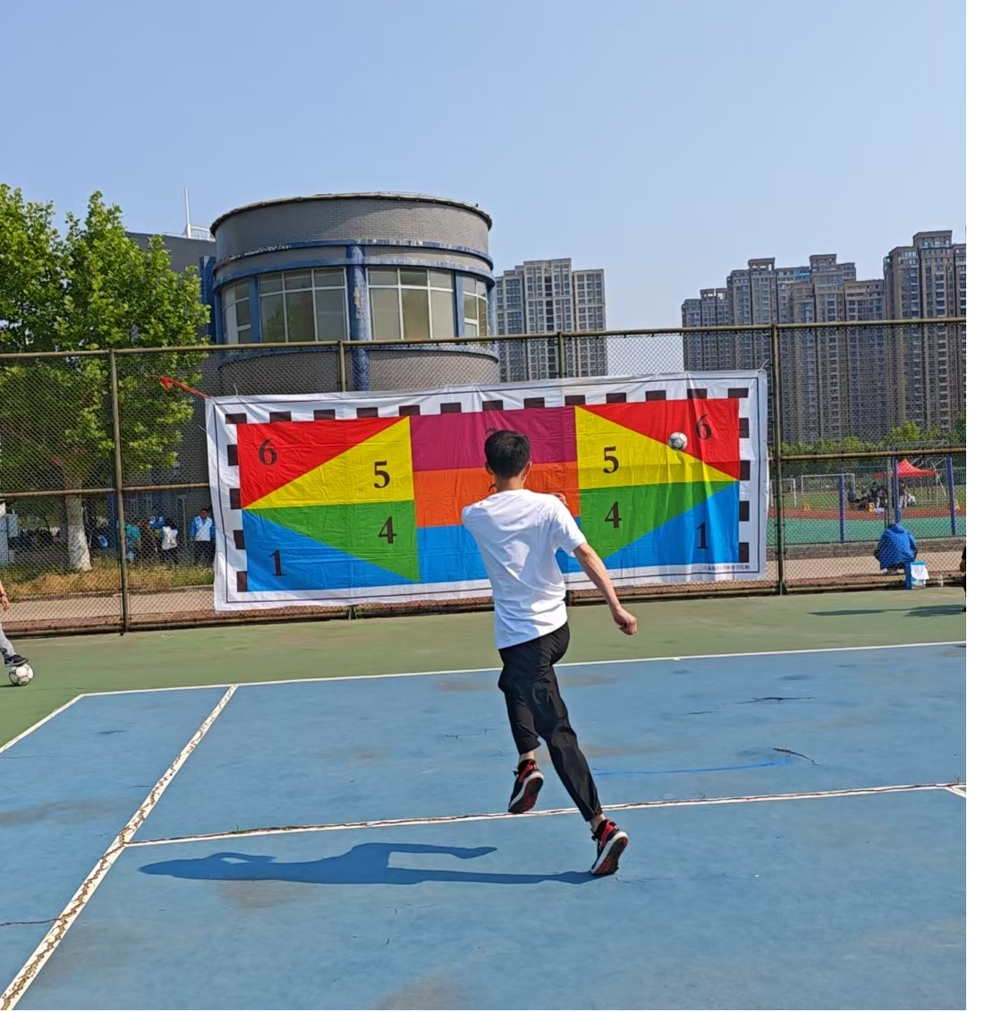 本次比賽采用“定點射門”賽制,塑膠籃排球場圍網(wǎng)上設(shè)足球墻,足球墻上根據(jù)進球難度設(shè)定不同得分,參賽者在距離球門11 米(罰球點)處進行足球射門,每人射門六次,以累計得分定勝負。明茂公司李曉龍展現(xiàn)出超凡的控球能力與精準度。他助跑、調(diào)整、起腳一氣呵成,足球如離弦之箭連續(xù)打中高分墻,贏得全場喝彩。