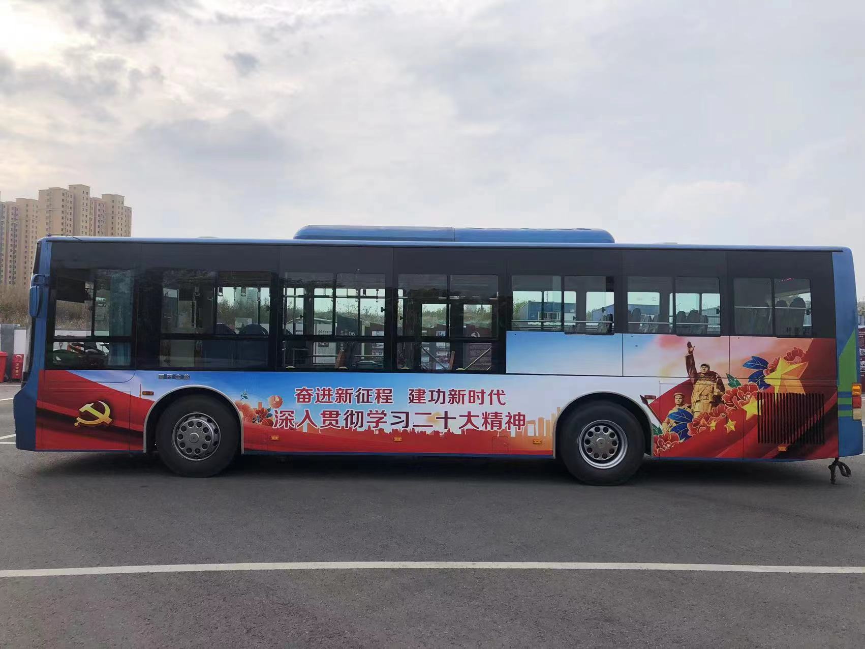 車身外觀,更新為以紅、藍(lán)色為主基調(diào),車身噴繪上“深入貫徹學(xué)習(xí)二十大精神”“奮進(jìn)新征程 建功新時代”等醒目的標(biāo)語,通過車輛每日運(yùn)行的方式穿梭于城市的大街小巷,增強(qiáng)社會宣傳受眾面,讓黨的理論“坐”上公交,走向社會。