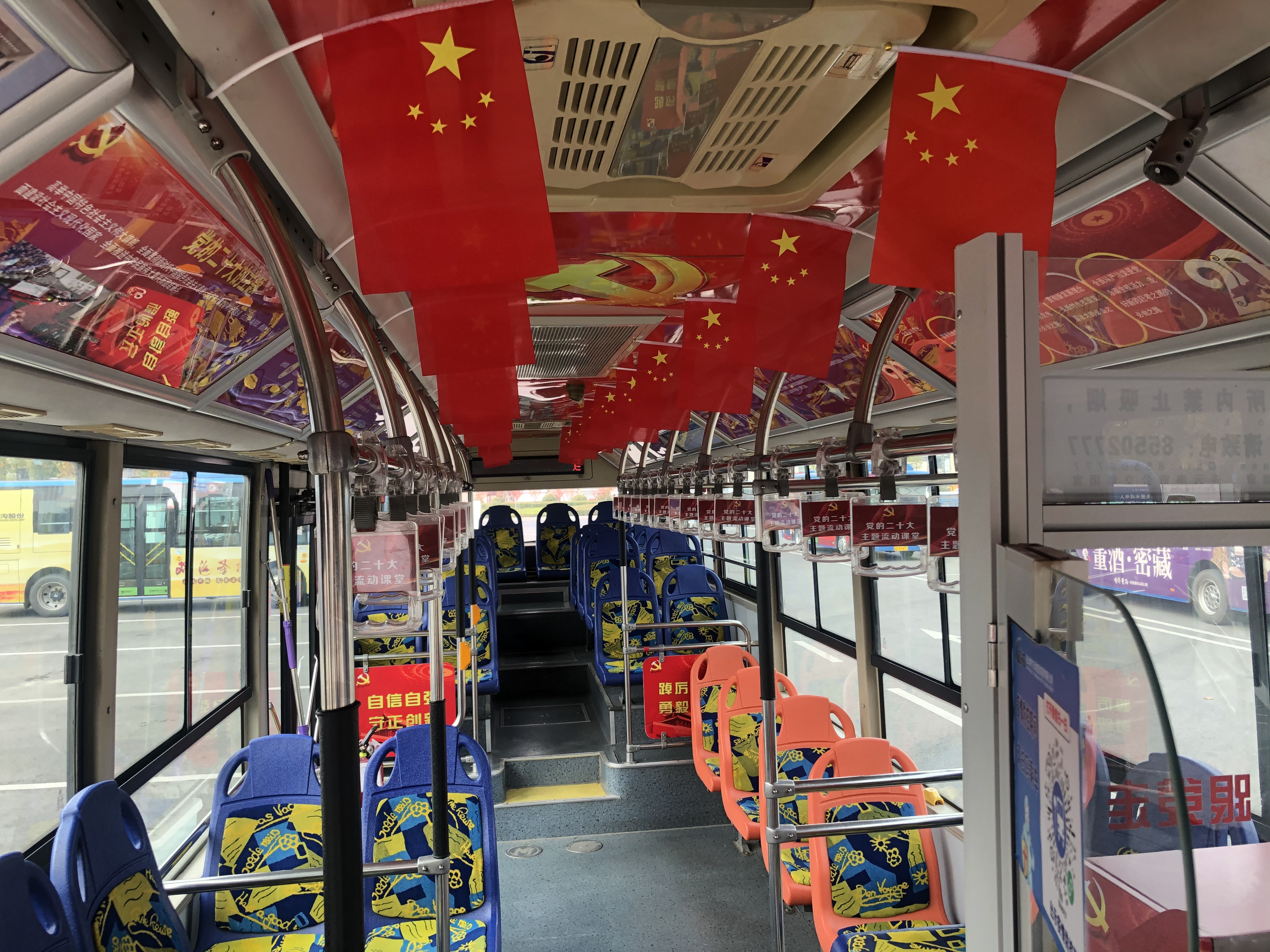 在暨2021年建黨百年“紅色黨史”主題車廂的基礎(chǔ)上,今年公交事業(yè)一部黨支部緊緊圍繞黨的二十大為宣傳主線,充分結(jié)合當(dāng)前工作實(shí)際,在持續(xù)深化黨史學(xué)習(xí)教育的同時,以公交20路為紅色宣傳載體再發(fā)力,分別將車身廣告及車內(nèi)展板進(jìn)行更新升級,以黨的二十大報告為主要宣傳內(nèi)容,打造了主題會議型車廂。