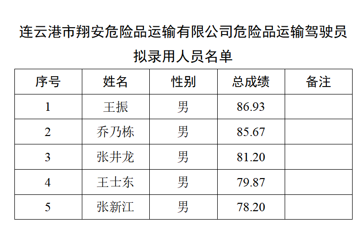 根據(jù)連云港市翔安危險品運輸有限公司危險品運輸駕駛員招聘公告有關規(guī)定和要求,現(xiàn)將本次招聘擬錄用人員名單予以公示。