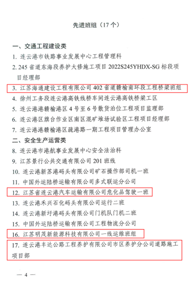 近日,從市總工會(huì)、市交通運(yùn)輸局傳來喜訊,集團(tuán)權(quán)屬公交集團(tuán)公交事業(yè)一部榮獲2022年全市“奮戰(zhàn)十四五、建功新時(shí)代”交通行業(yè)勞動(dòng)競(jìng)賽先進(jìn)集體,海建公司402省道贛榆南環(huán)段工程橋梁班組、汽車公司?;否{駛一班、明茂新能源公司一線運(yùn)維班組和豐達(dá)公司市區(qū)養(yǎng)護(hù)分公司道路施工項(xiàng)目部四個(gè)班組榮獲先進(jìn)班組,公交集團(tuán)周卓文被評(píng)為先進(jìn)個(gè)人,海建公司被評(píng)為優(yōu)秀組織單位。
