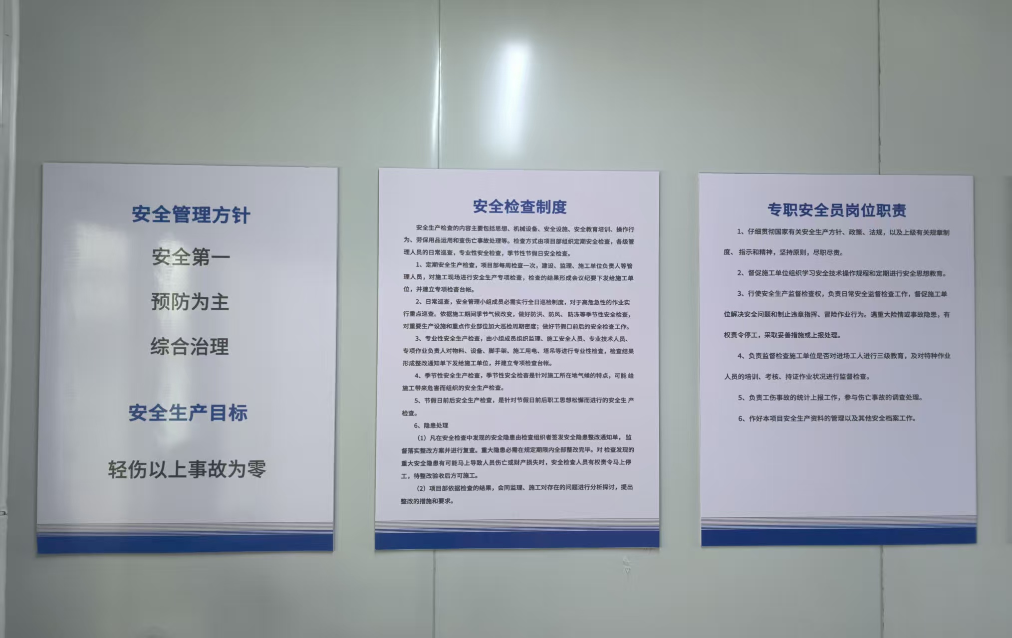 公司結合實際梳理安全職責,覆蓋從項目負責人到各崗位工作人員的全鏈條責任,包含施工現場管理、安全監(jiān)督、獎懲辦法等核心內容。這些職責以醒目展板形式懸掛于辦公室顯眼位置,使工作人員日常隨時可見自身安全責任,確保責任明晰、心中有數。同步上墻的還有安全檢查制度,明確規(guī)定檢查頻率、內容、標準及問題整改流程。制度涵蓋日常施工現場巡查、定期專項安全檢查、季節(jié)性安全隱患排查等場景。對檢查發(fā)現的問題,實行責任到人、限時整改機制,并嚴格執(zhí)行復查驗收,形成閉環(huán)管理。