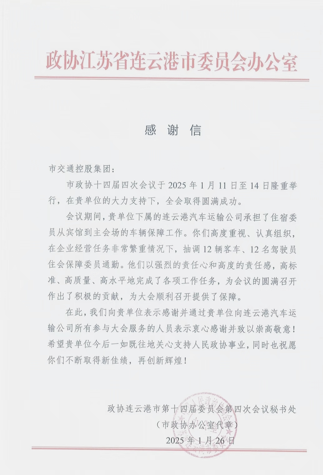 政協(xié)連云港市第十四屆委員會(huì)第四次會(huì)議秘書處在感謝信中,不僅向市交通控股集團(tuán)所屬的連云港汽車運(yùn)輸有限公司表達(dá)誠摯謝意,還向所有參與服務(wù)的人員致以崇高敬意。