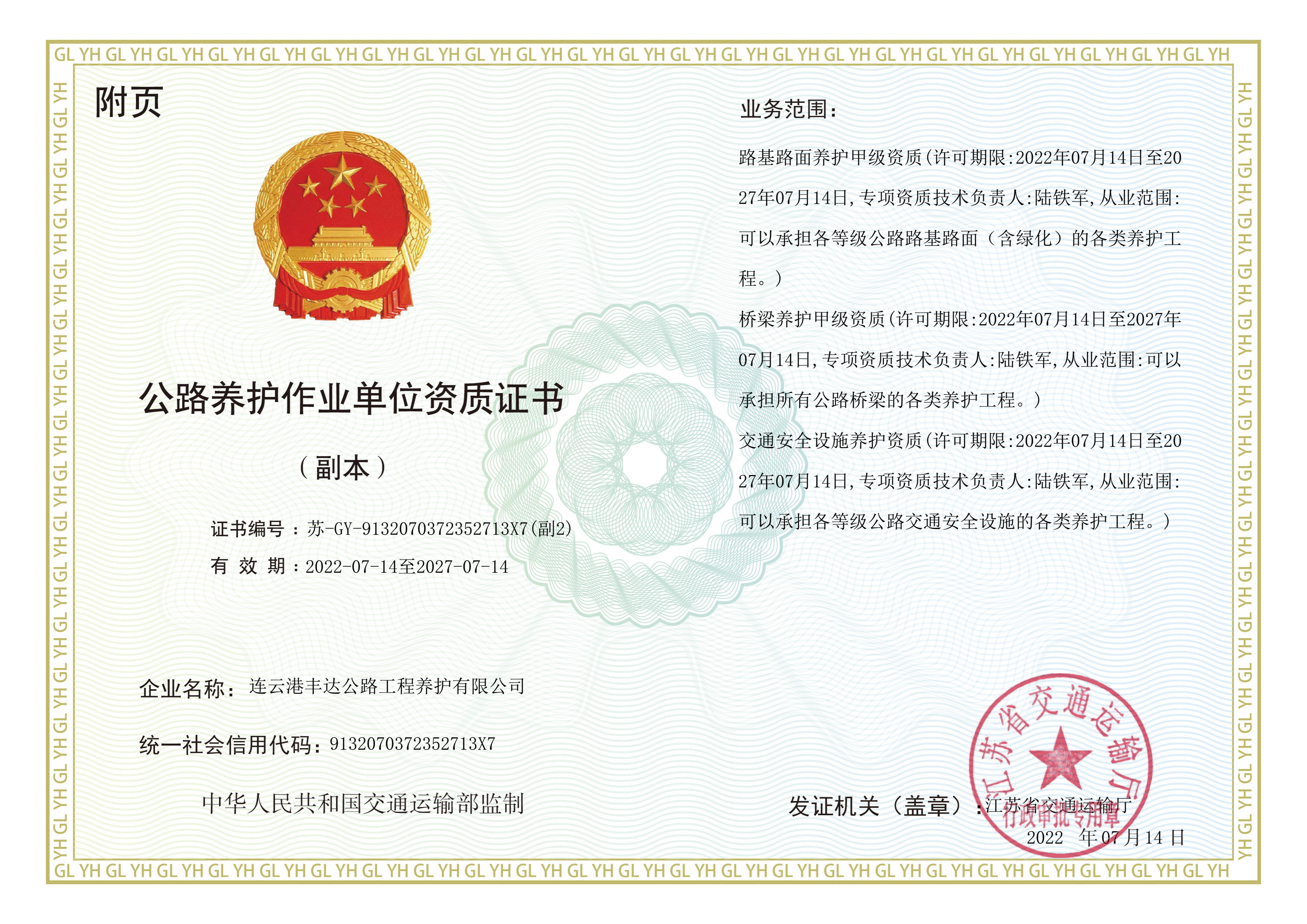 豐達(dá)公司公路養(yǎng)護作業(yè)單位路基路面甲級、橋梁甲級、 交通安全設(shè)施資質(zhì)申報成功